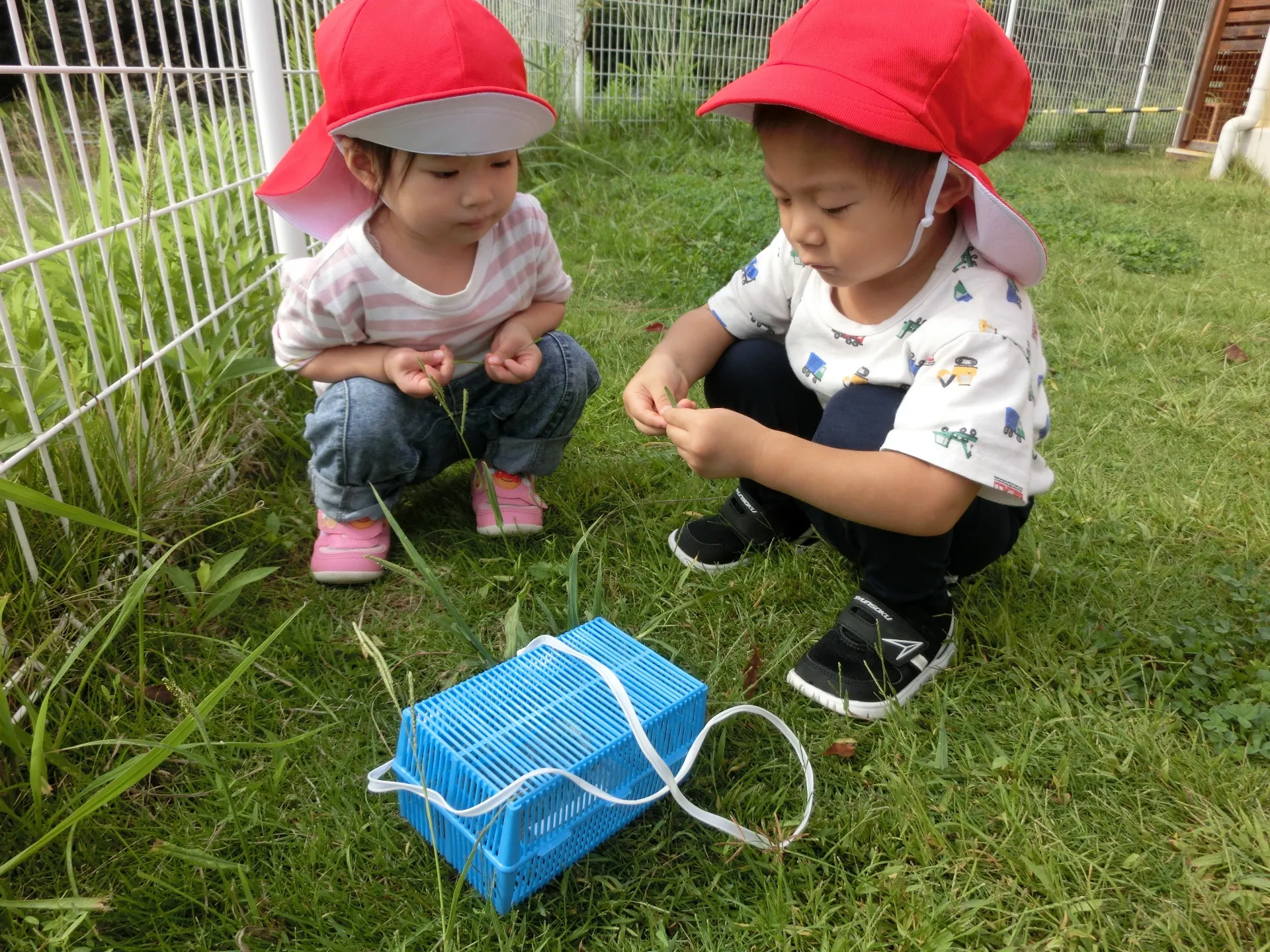 一緒に虫かごの中にいるバッタに草をあげようとしています。お友達同士での関わりも多く見られるようになってきました!