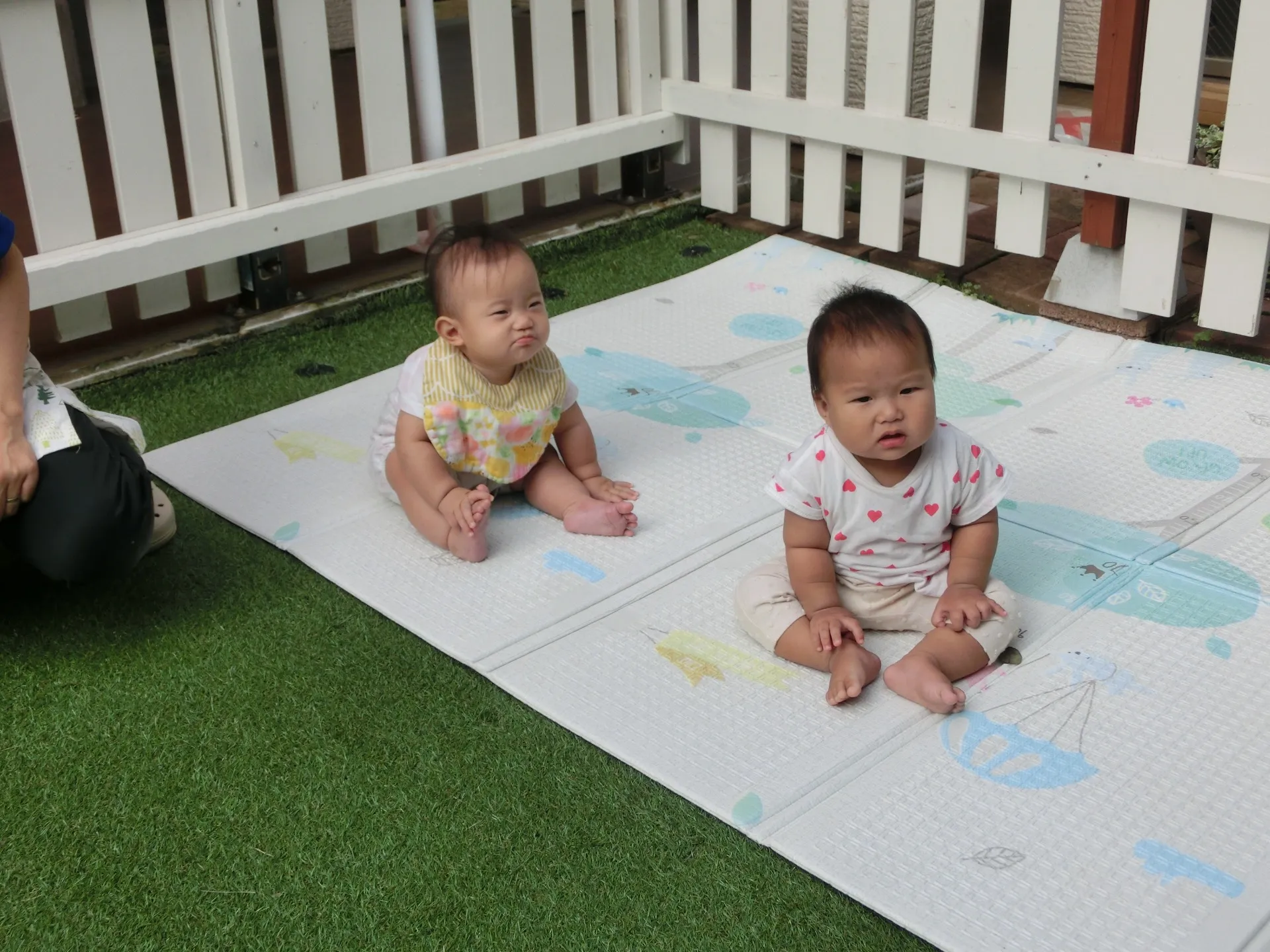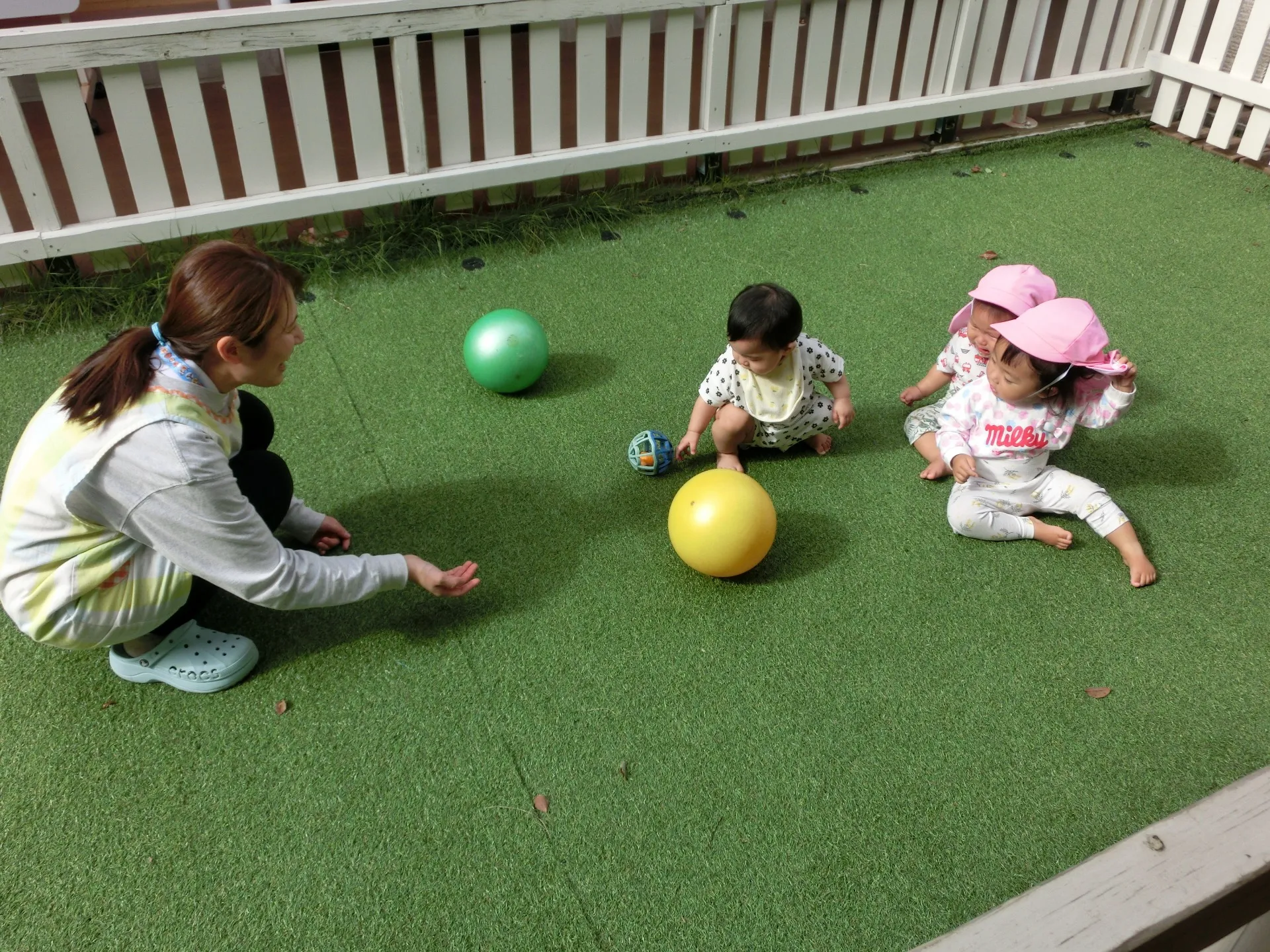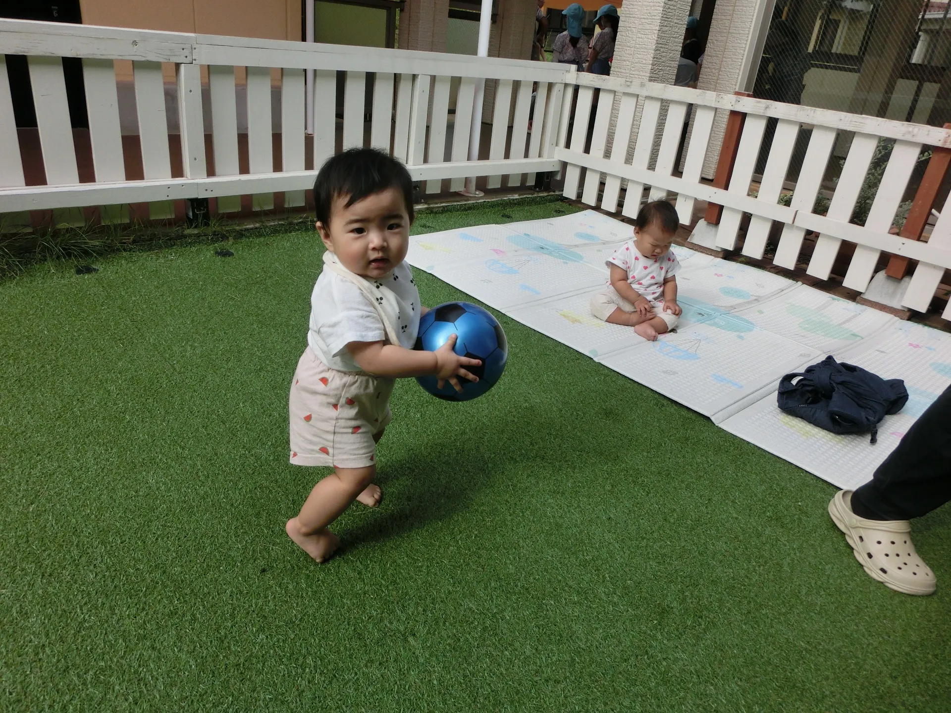 0歳児クラスはバギーに乗って園内をお散歩したり人工芝で遊んだりしながら楽しく過ごしています😊